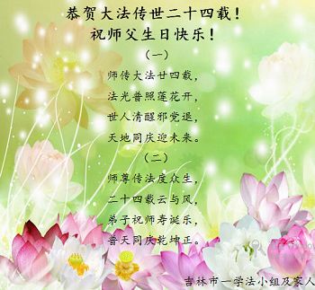 吉林市一学法小大法弟子及家人恭贺大法传世二十四载!祝师父生日快乐!