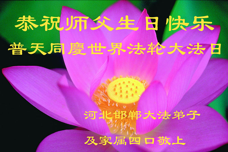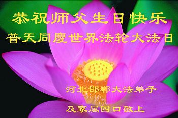 河北邯郸大法弟子及家属四口恭祝师父生日快乐!普天同庆世界法轮大法日!