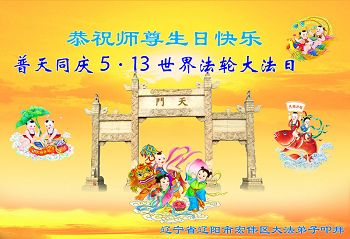 辽宁省辽阳市宏伟区大法弟子恭祝师尊生日快乐!普天同庆五•一三世界法轮大法日!