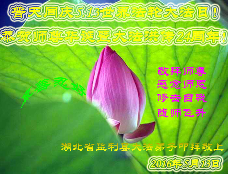 在5.13神圣而伟大的世界法轮大法日,在全世界同庆同颂的殊胜日,我们湖北省监利县大法弟子敬拜师尊,感念师恩!师父啊,您为救度众生承受了无法想象的巨难,为众生操尽了心!师父,您辛苦了!我们为今生今世能成为大法弟子感到无比荣幸!在今后不多的日子里唯有用一颗纯净的心,牢记师父的谆谆教诲,勇猛精進,去执无漏,跟上正法進程,圆容师尊所要的,才能不辜负师父的慈悲救度。谢谢师父! 北京东城区一家三口大法弟子恭祝恩师生日快乐!庆祝世界法轮大法日!