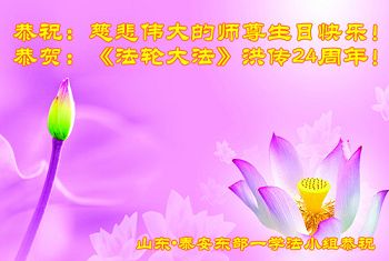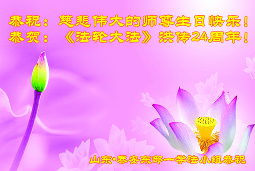 山东泰安东部一学法小组大法弟子恭祝慈悲伟大的师尊生日快乐!恭贺法轮大法洪传二十四周年!