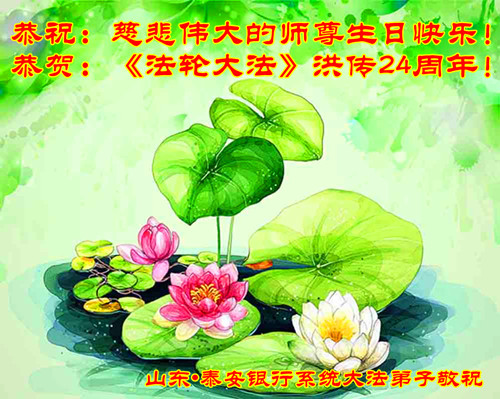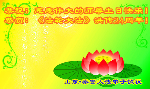 山东泰安大法弟子恭祝慈悲伟大的师尊生日快乐!恭贺法轮大法洪传二十四周年!