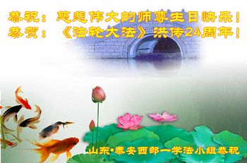 山东泰安西部一学法小组大法弟子恭祝慈悲伟大的师尊生日快乐!恭贺法轮大法洪传二十四周年!