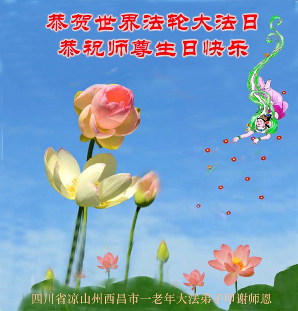 四川省凉山州西昌市一老年大法弟子恭贺世界法轮大法日!恭祝师尊生日快乐!