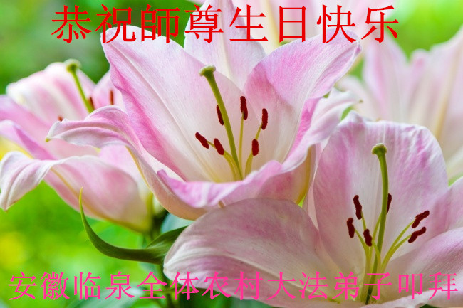 合十:法轮大法好!安徽砀山大法弟子向师父叩拜:恭祝慈悲伟大的师父生日快乐!庆贺世界法轮大法日! 师父正法,洪恩浩荡,圣恩难报,唯有精進,紧跟师父走好正法最后之路,维护大法抓紧救人,完成我们的历史大任,兑现史前誓约,不辜负师父对我们的慈悲救度。 安徽省宿州市砀山县大法弟子恭祝慈悲、伟大的师尊生日快乐!