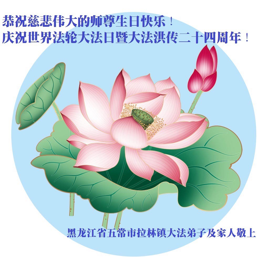 黑龙江省哈尔滨市五常市拉林镇大法弟子全家恭祝师尊生日快乐!