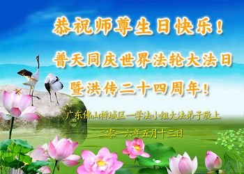 同祝世界法轮大法日! 广东佛山禅城区一学法小组大法弟子恭祝慈悲伟大的师尊生日快乐!