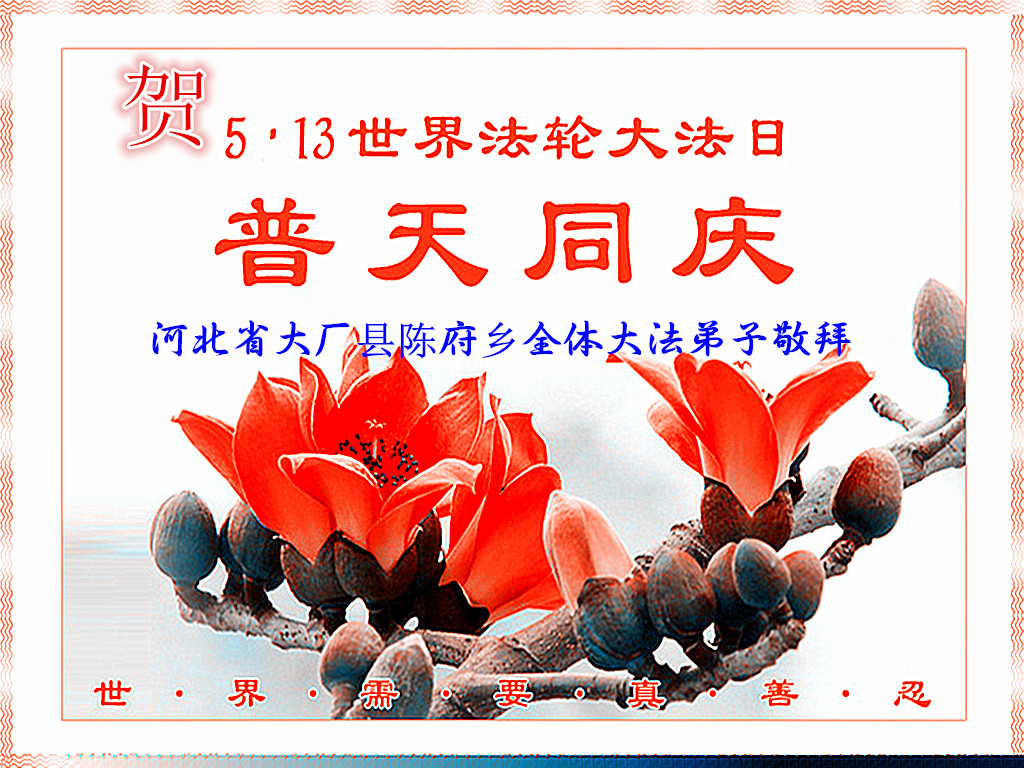 普天同庆世界法轮大法日,弟子叩拜师尊。 河北省廊坊市大厂县陈府乡全体大法弟子恭贺法轮大法日!