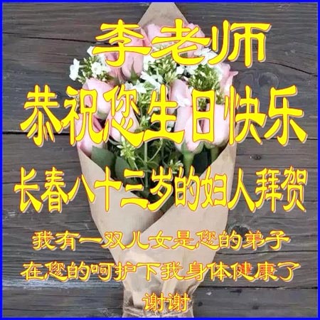 师父:恭祝您生日快乐! 普天同庆法轮大法或者二十四周年 长春东朝阳路炼功点大法弟子拜贺 恭祝师父生日快乐! 庆祝法轮大法洪传二十四周年 弟子感谢您的救度之恩 中国大陆大法弟子敬贺 李老师 恭祝您生日快乐! 长春八十三岁的妇人拜贺 我有一双儿女是您的弟子,在您的呵护下我身体健康了,谢谢!