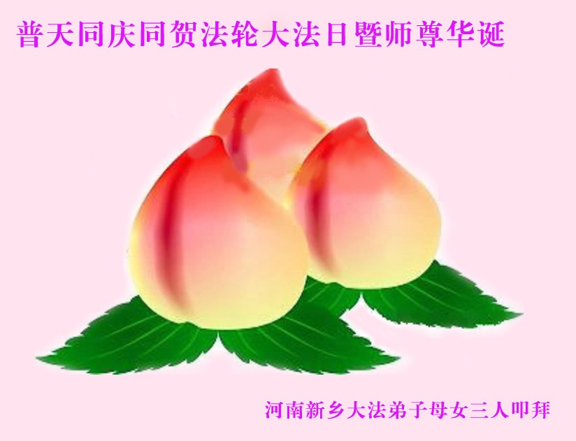 师尊您好!师尊辛苦了!恭祝师尊生日快乐!热烈庆祝世界法轮大法日! 河南省南阳市新野县大法弟子一家三口恭祝慈悲伟大的师父生日好!