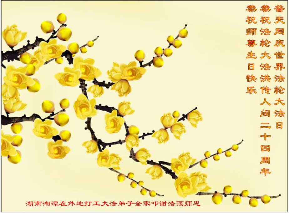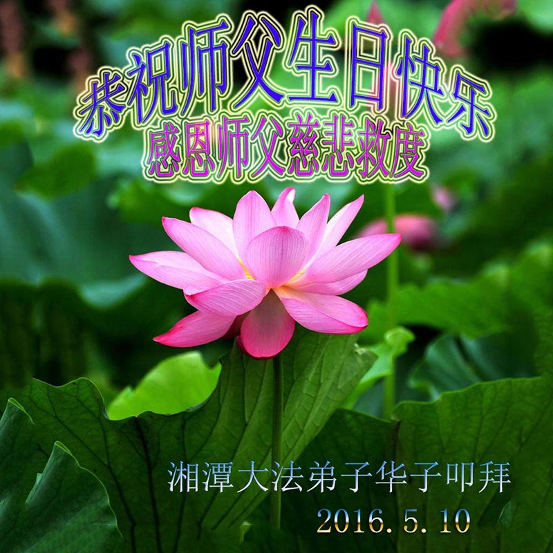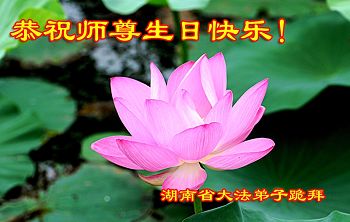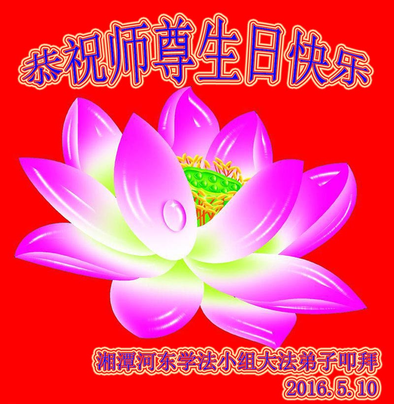 在世界法轮大法日来临之时, 我们学法小组全体学员向慈悲伟大的师父问好:敬祝师父生日快乐!庆祝法轮大法洪传24周年暨第十七届世界法轮大法日! 湖南岳阳市一学法小组全体学员 湖南省湘潭河东学法小组大法弟子恭祝师尊生日快乐!