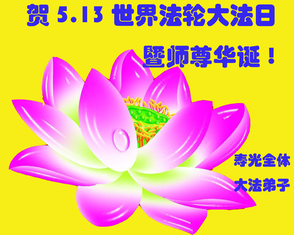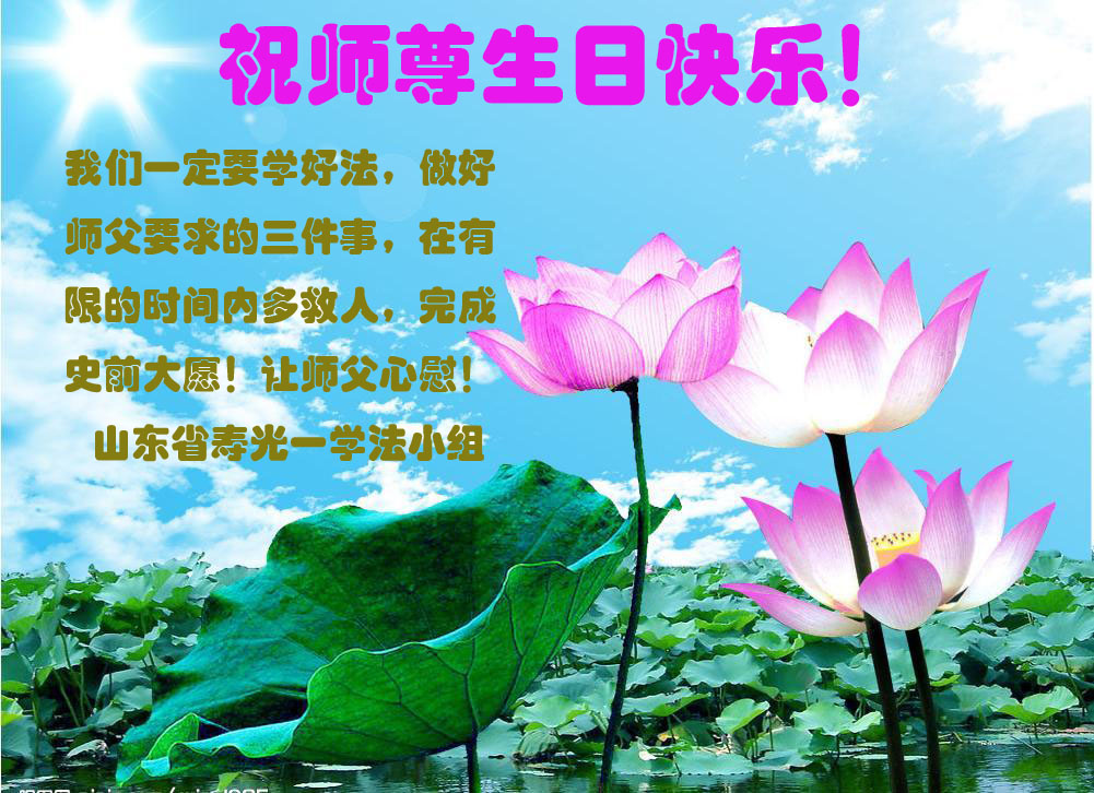 感恩师父对我们的慈悲救度,把我们从地狱里捞起,为我们洗去了尘世的肮脏,给我们健康的身体,让我们走上了返本归真的路,师父的恩德我们无以报答,只有精進实修,做好三件事,多救人,完成史前大愿。在5.13这喜庆的日子里,我们恭祝师父生日快乐!跪拜师尊! 山东潍坊临朐一学法小组大法弟子祝伟大的师尊生日快乐!祝贺世界法轮大法日!