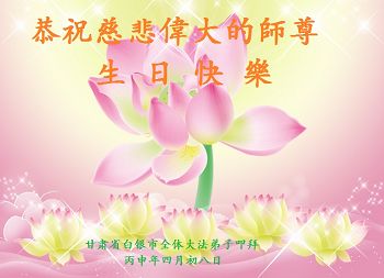 甘肃省兰州大法弟子恭祝慈悲伟大的师尊生日快乐!