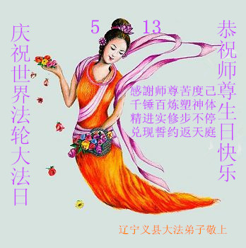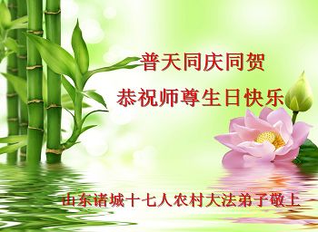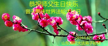 师父好。恭祝师父生日快乐! 普天同庆同颂师父暨法轮大法“真善忍”洪传全世界二十四周年:开天辟地、天清宇明、苍生泽被;众生、大法弟子永远敬、颂师父大法救度之恩! 甘肃省甘南藏族自治州舟曲县农村大法弟子敬叩 双手合十 山东省烟台市莱州市农村大法弟子恭祝师尊生日快乐!