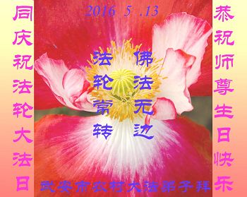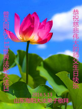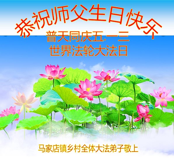 【明慧网二零一六年五月十三日】 辽宁丹东市东港市马家店镇乡村全体大法弟子恭祝师尊华诞暨世界法轮大法日!