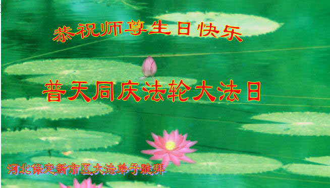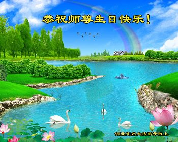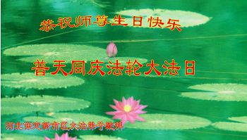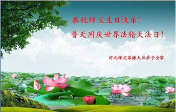 慈悲伟大的师父您好!一年一度的大法日暨您的生日到来之际,首先祝您生日快乐!弟子们衷心盼望您能早日回到大陆,弟子们想念您!师父您辛苦啦! 河北省高碑店一学法小组全体学员敬上 河北省保定雄县大法弟子恭贺法轮大法日!祝师父生日快乐!