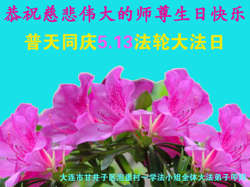 辽宁省大连甘井子泡崖一学法小组全体大法弟子恭祝慈悲伟大的师尊生日快乐!恭贺5.13世界法轮大法日!