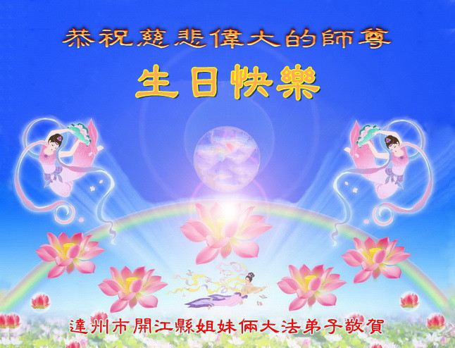 四川省达州市开江县姐妹俩大法弟子恭祝慈悲伟大的师尊生日快乐!