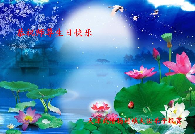 师父您好!祝您生日快乐! 身为大陆大法弟子,我们感到无比荣幸。中国大陆才是正法的主战场,我们会珍惜身在中国大陆的宝贵的修炼机缘,兑现在大陆救度众生的誓约,“以法为师”,不以人为师,遇事用法衡量,放下名利情,做好三件事,配的上大陆大法弟子的神圣称号。 天仙子•颂师恩 时日匆匆如逝水, 修炼机缘多宝贵。 宝书法理破迷茫, 开智慧,洪约兑, 风雨兼程终不悔。 恶浪沉浮出圣蕊, 浴火莲梅枝愈翠。 真言唤醒众乡亲, 前途美,得祥瑞, 大法福泽全社会。 黑龙江哈尔滨大法弟子恭贺世界法轮大法日!