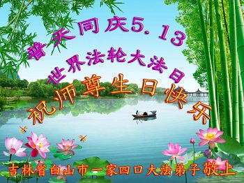 普天同祝同庆世界法轮大法日! 感谢伟大师尊的慈悲苦度!弟子要放下自我,修去在常人中形成的各种观念和执着,更加努力的做好“三件事”,救度更多的众生,让师尊多一份欣慰,少一分操劳! 祝慈悲伟大的师父生日快乐! 重庆垫江大法弟子 二零一六年五月十三日 吉林省白山市一家四口大法弟子恭贺世界法轮大法日!