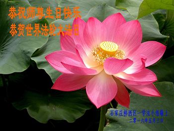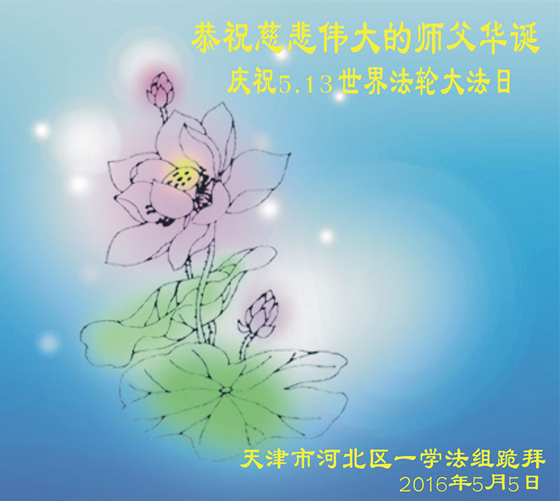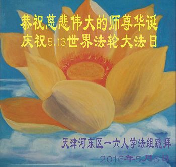 【明慧网二零一六年五月十三日】 天津市河北区一学法小组大法弟子恭祝慈悲伟大的师父华诞暨5.13世界法轮大法日!