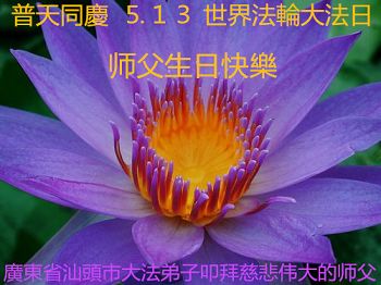 在世界法轮大法日暨师父华诞来临之际,无限感恩师父救度,千言万语、万语千言汇集一句话:祝愿法轮大法弘传世界;恭贺伟大、慈悲的师父生日快乐!