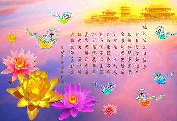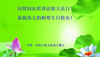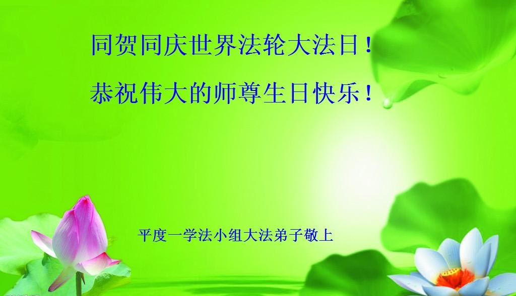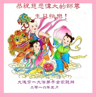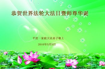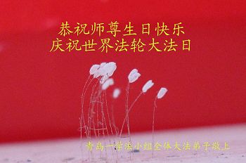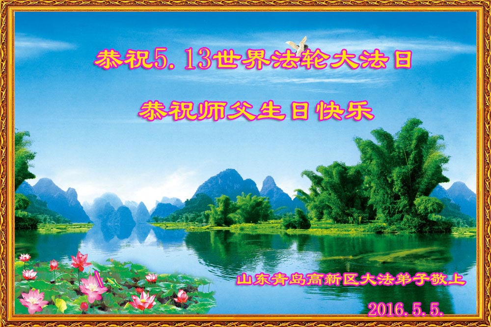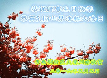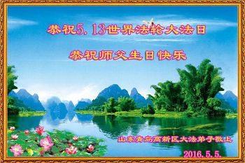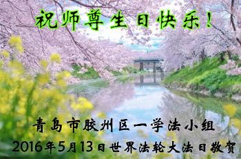 师尊传法二十四春秋,大法徒沐浴在真、善、忍的佛光中。感恩师尊一次次扶起,感恩师尊一次次点悟,师尊的慈悲救度,弟子无法用人类的语言表述,只有坚持实修,多救世人,来回报师尊,请允许我们祝师尊生日快乐! 青岛市胶州区一学法小组敬贺 二零一六年五月十三日世界法轮大法日 山东省青岛开发区大法弟子夫妇恭祝师尊生日快乐!暨世界法轮大法日