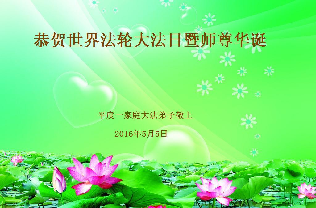 山东青岛平度一家大法弟子三人恭祝师尊生日快乐!同贺5.13世界法轮大法日! 2016年5月3日 山东省青岛市即墨市大法弟子恭祝伟大的师尊生日快乐!恭祝普天同庆513全世界法轮大法日