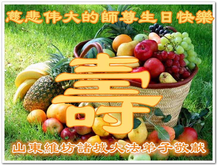师父您好!祝您生日快乐!身为大陆大法弟子,我们感到无比荣幸。中国大陆才是正法的主战场。我们会珍惜身在中国大陆的宝贵的修炼机缘,兑现在大陆救度众生的誓约,“以法为师”,不以人为师,遇事用法衡量,放下名利情,做好三件事,配的上大陆大法弟子的神圣称号。 天仙子 颂师恩 时日匆匆如逝水, 修炼机缘多宝贵。 宝书法理破迷茫, 开智慧,洪约兑, 风雨兼程终不悔。 恶浪沉浮出圣蕊, 浴火莲梅枝愈翠。 真言唤醒众乡亲, 前途美,得祥瑞, 大法福泽全社会。 山东潍坊诸城全体大法弟子恭祝师尊生日快乐!
