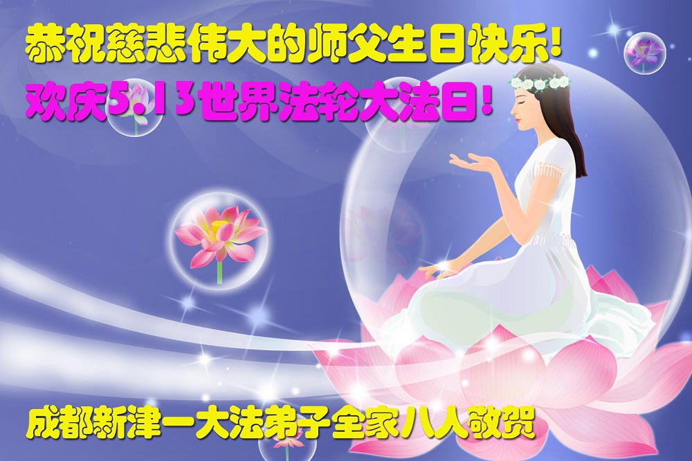 四川省成都市青白江区一大法弟子携全家恭祝师尊生日快乐!恭贺大法洪传二十四周年暨世界法轮大法日!