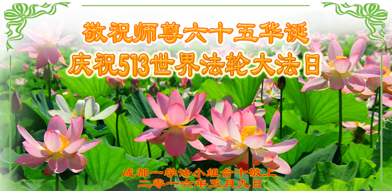 庆祝世界法轮大法日! 敬祝师父六十五华诞! 四川省成都一学法小组合十敬上 四川成都大法弟子恭祝师尊生日快乐!