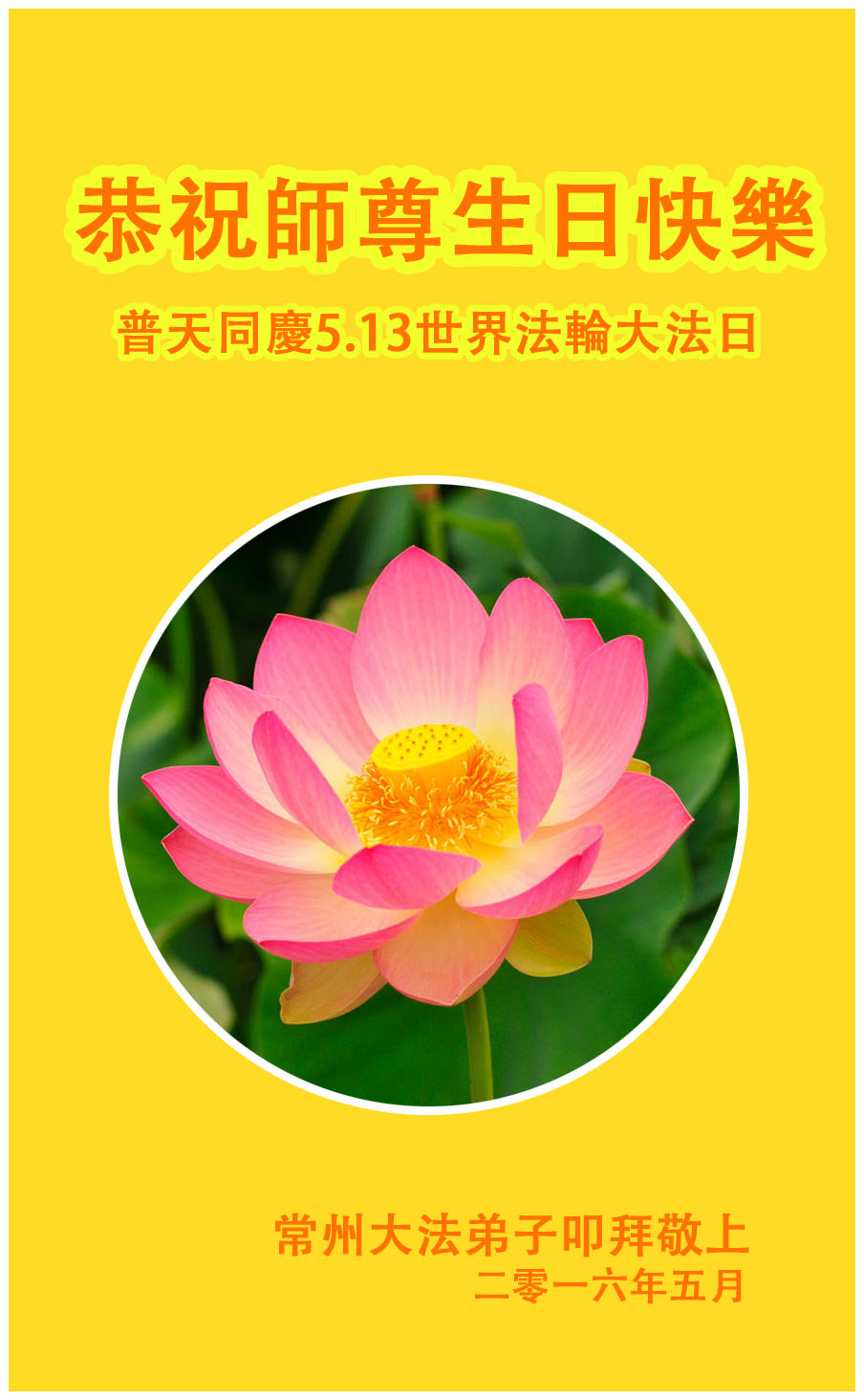 恭贺世界法轮大法日!庆祝法轮大法洪传二十四周年! 弟子要更加精進,跟上正法進程,努力做好三件事,多救人。弟子叩谢师尊的慈悲救度。 江苏常州南大法弟子恭祝师尊生日快乐!