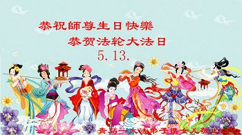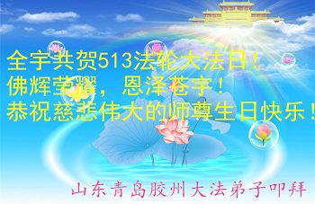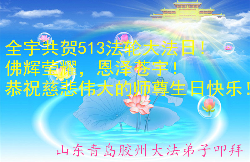 山东青岛市胶州市一家三名大法弟子恭祝慈悲伟大的师尊生日快乐!普天同庆513世界法轮大法日! 山东青岛李沧区一学法小组全体大法弟子恭祝师父生日快乐!