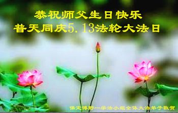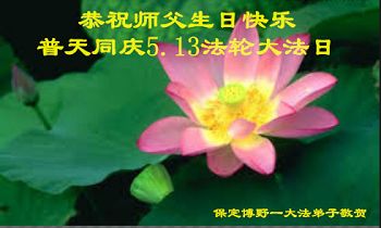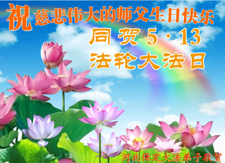叩拜恭祝慈悲伟大的师父生日快乐!弟子们在助师正法中提高心性,与国外同修形成强大的整体,加大力度讲真相救人,极大的震慑了邪恶,同时,在师父的护佑下,相互提醒,不断修正自己,去掉阻碍救人的一切私心杂念,多救人、快救人! 河北省保定一大法弟子恭祝师父生日快乐!普天同庆5.13世界法轮大法日!