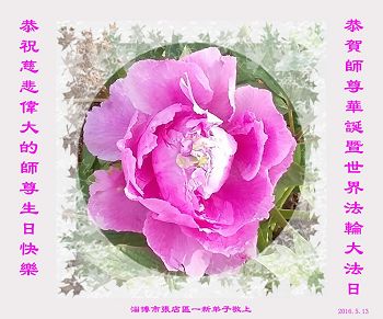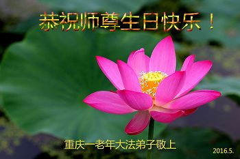 恭祝师尊生日快乐! 慈悲伟大的师尊好!师尊辛苦了!师尊为弟子操尽了心,弟子唯有做好三件事,跟上正法進程,多救人,兑现誓约! 四川成都市一大法弟子及老伴跪拜 二零一六年五月九日 天津大法弟子代表刚得法的老母及全家人恭祝师尊生日快乐!
