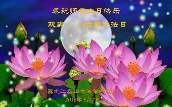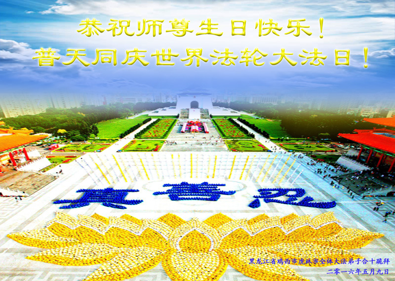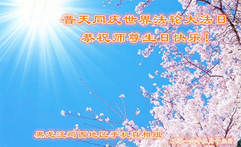 我们资料点大法弟子恭祝师尊生日快乐!我们的小花开的越来越多,做出最好的真相,救度更多众生,不辜负师尊的苦度! 2016年5月9日 黑龙江鸡西地区大法弟子恭祝师尊生日快乐!普天同庆世界法轮大法日!