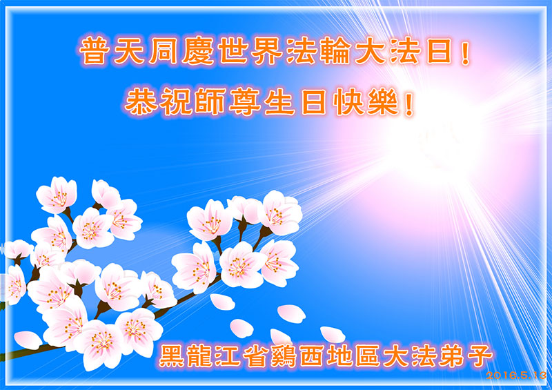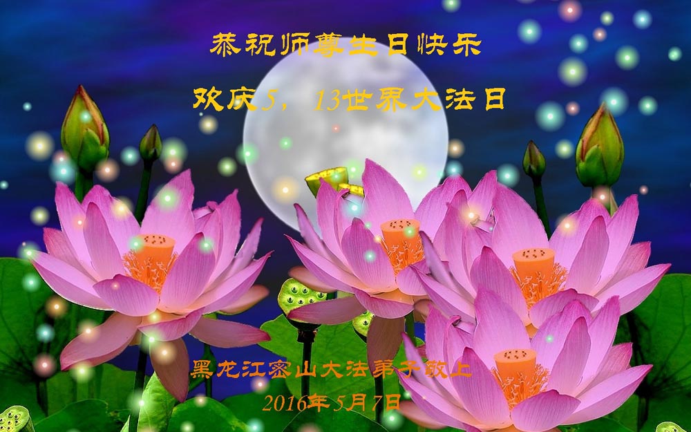 黑龙江省虎林市六位大法弟子学法组,问候师尊六十六岁生日快乐!在今后修炼中努力精進实修,做好三件事,多救众生,感谢师尊慈悲苦度,跟师尊回家。双手合十。 2016年5月7日 黑龙江省鸡西市鸡东县全体大法弟子恭祝世界法轮大法日!恭祝师尊生日快乐!