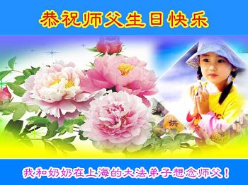 师父您好! 92年师父开始传法那年我来到人间,4岁不到随奶奶得法。奶奶炼功时,我看到满屋的法轮象雪花一样的飘,兴奋地扑向奶奶喊着:奶奶,好漂亮的雪飘飘!爸爸都没有我得法早。一次,我被邻居受惊的小狗狗撞倒在地,很长时间都没有上来气,急得爸爸不知怎么好。是师父救了我! 师父教我炼功,爸爸惊奇的问我?是谁让你炼的功?我说是师父!师父刚才站在这教我炼功。爸爸打电话问奶奶是咋回事?半年后,爸爸也得法了! 炼功点上的爷爷、奶奶和叔叔阿姨们亲切地叫我“老弟子”!我还随爸爸妈妈下到地县参加过洪法,教哥哥姐姐们炼功呢…。回忆起童年的那段时光太幸福了! 今天是师父的生日,我将爸爸替我精心制作的也代表奶奶、妈妈及这段最美好的记忆献给师父!祝师父生日快乐! 上海徐汇区二个学法小组全体大法弟子恭贺师尊生日快乐!