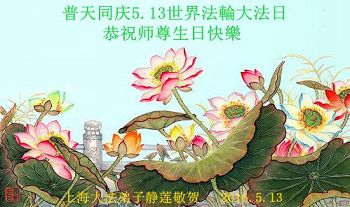 普天同庆法轮大法日!恭祝慈悲伟大的师尊生日快乐!师尊您辛苦了!您给予弟子的,弟子永远也报答不了,弟子万分感谢您! 上海一大法弟子恭贺世界法轮大法日暨师尊华诞!