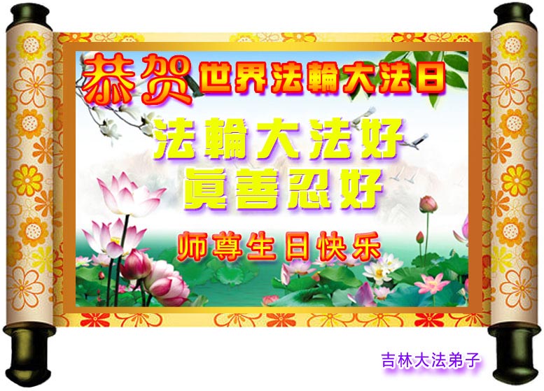 庆法轮大法洪传世界二十四周年!庆贺第十七届世界法轮大法日! 吉林省吉林市全体大法弟子 合十敬上 吉林市8名大法弟子及家人恭祝师尊华诞暨世界法轮大法日!
