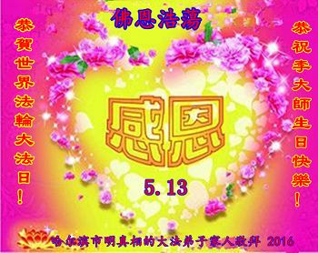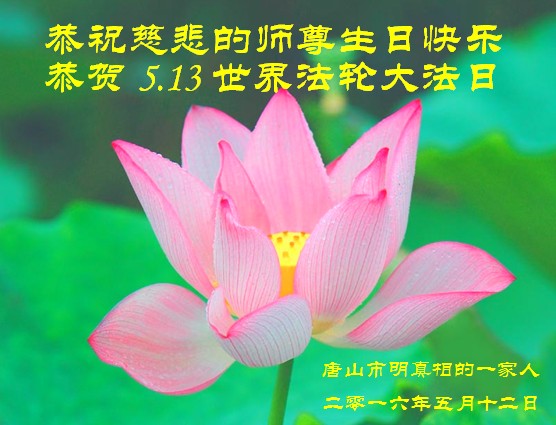 【明慧网二零一六年五月十三日】 河北唐山市明真相的一家人恭祝师尊生日快乐!恭贺世界法轮大法日!