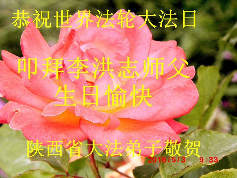 恭贺法轮大法洪传二十四年! 恭贺慈悲伟大的师尊生日快乐! 向伟大的师尊表示崇高的敬意! 感谢师尊的慈悲救度! 感谢大法洪恩浩荡! 救度世人明真相,胸怀大法随师还! 陕西省扶风县六学小组大法弟子敬上 2016年5月10日 陕西省宝鸡市大法弟子敬祝师尊生日快乐!庆祝“5.13”世界法轮大法日!
