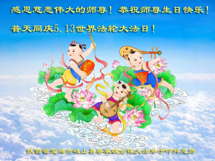 庆祝法轮大法日的到来,并恭贺师尊生日快乐!在正法的最后时刻,我要努力做好三件事,来报答永生永世难报答的师恩。 陕西省宝鸡市大法弟子 陕西宝鸡市全家大法弟子及家属恭祝慈悲伟大的师尊生日快乐!恭贺世界法轮大法日!