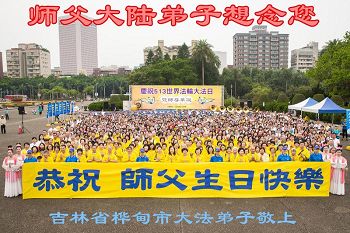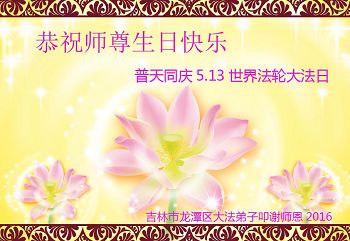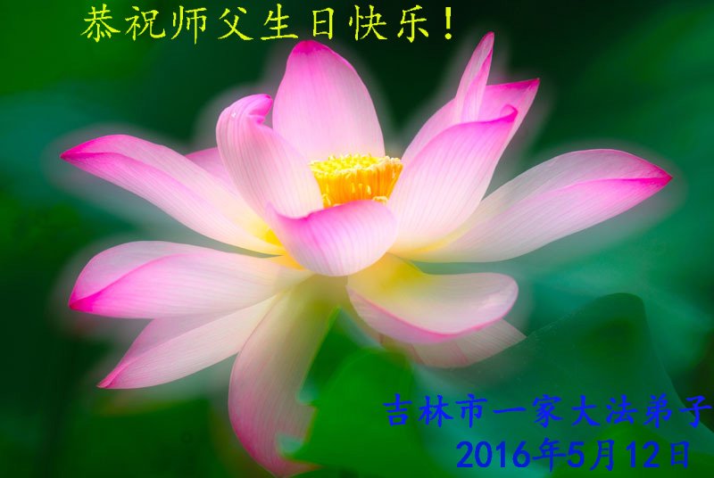 师尊好: 二零一六年法轮大法日到来了,吉林市大法弟子祝慈悲伟大的师尊生日快乐,师尊辛苦了!家乡的弟子想念您,我们会继续努力做好三件事,助师正法路不停,满载而归随师还! 合十 叩拜 吉林市大法弟子 二零一六年五月九日 吉林省吉林市蛟河市白石山大法弟子恭祝慈悲伟大的师尊生日快乐!叩谢师尊普度之恩!