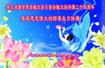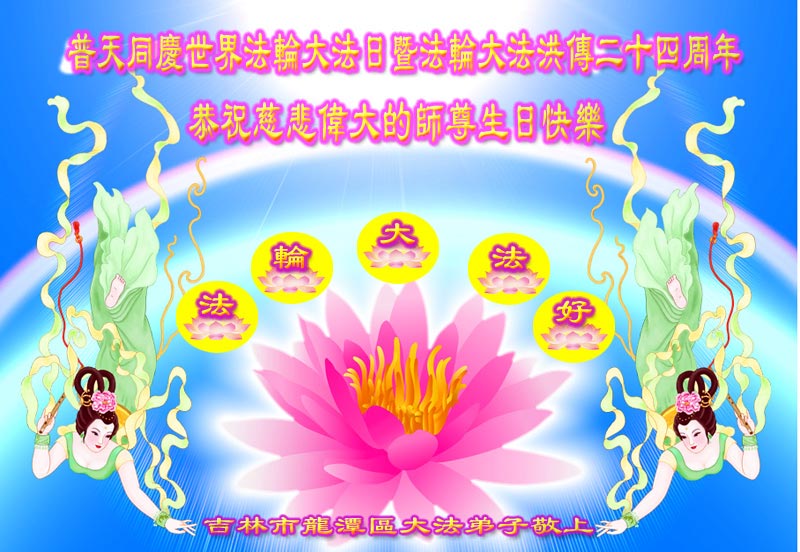 恭祝师尊好 一家心愿表 叩首谢师父 惟愿师尊笑 春风把信捎 普天佛光照 祝师生日好 梅莲花枝俏 吉林市大法弟子恭祝师父生日快乐暨世界法轮大法日!