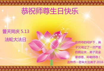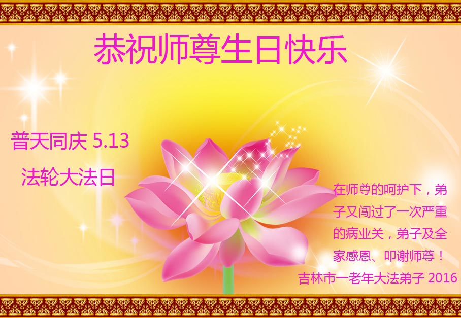 【明慧网二零一六年五月十三日】 吉林市龙潭区缸窑镇全体大法弟子恭祝师尊生日快乐!