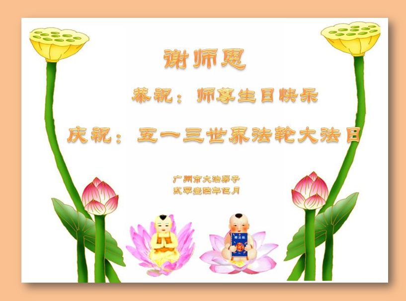 我们是母女俩大法弟子,感恩师父为我们修炼的巨大付出。我们在修炼的路上磕磕碰碰走到今天,师父一直呵护着我们,为我们的修炼提高做了很多很多。我们一定认真学好法,精進实修,做好三件事,圆满随师尊回到自己真正美好的家园。 叩谢师尊 江西南昌母女俩大法弟子 江西省赣州大法弟子恭祝伟大的师尊生日快乐!恭祝法轮大法洪传世界二十四周年!普天同庆世界法轮大法日!