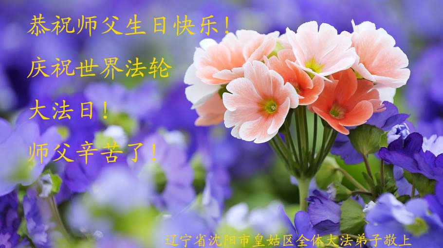 辽宁省沈阳市皇姑区大法弟子:恭祝李洪志师尊生日快乐!感恩师尊慈悲救度!师尊您辛苦了! 普天同庆!恭祝世界法轮大法日! 辽宁省沈阳市皇姑区全体大法弟子恭祝师父生日快乐!