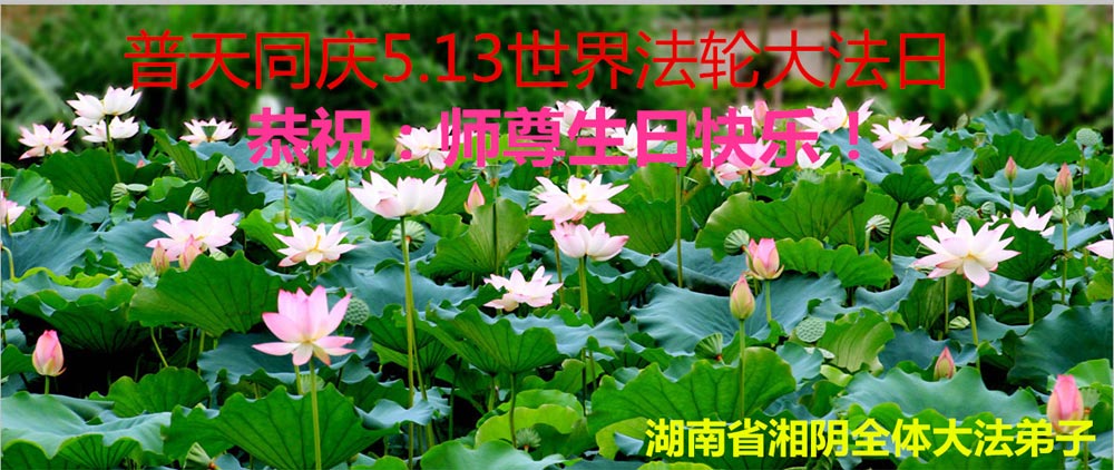 在此普天同庆的大好日子里,湖南怀化全体大法弟子恭祝师尊生日快乐!普天同庆、同祝世界法轮大法日! 弟子们虽然也在讲真相、做三件事,但离师尊的要求差的太远太远,愧对师尊、愧对大法! 弟子们唯有在以后的日子里,紧跟正法的進程,全心全力做好三件事,不辜负师尊的慈悲苦度,不辜负师尊为我们的巨大承受! 湖南怀化全体大法弟子叩谢师恩! 湖南湘潭三大法弟子恭贺师父生日暨法轮大法日!
