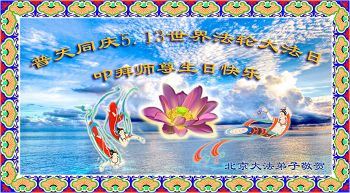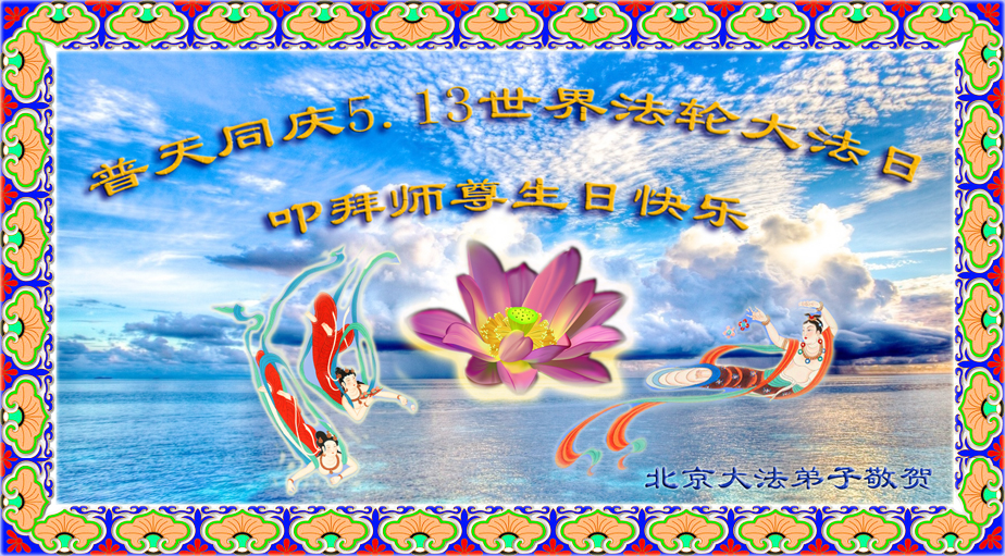 恭贺第十七届世界法轮大法日!恭祝师父生日快乐!师父您辛苦了,弟子用尽人间的语言也表达不了对您的感恩。俗话说:受人滴水之恩,当涌泉相报。您给弟子净化身体、地狱除名,在修炼的这条路上无时无刻的都在看护着弟子,并授予我们正法时期大法弟子的称号等等。师父啊,弟子拿什么报答您,弟子只有精進实修,做好三件事,珍惜最后剩下的分分秒秒,修好自己,去掉各种人心,兑现誓约,以报师恩。 最后恭祝伟大的师父生日快乐! 北京大法弟子敬贺法轮大法日!